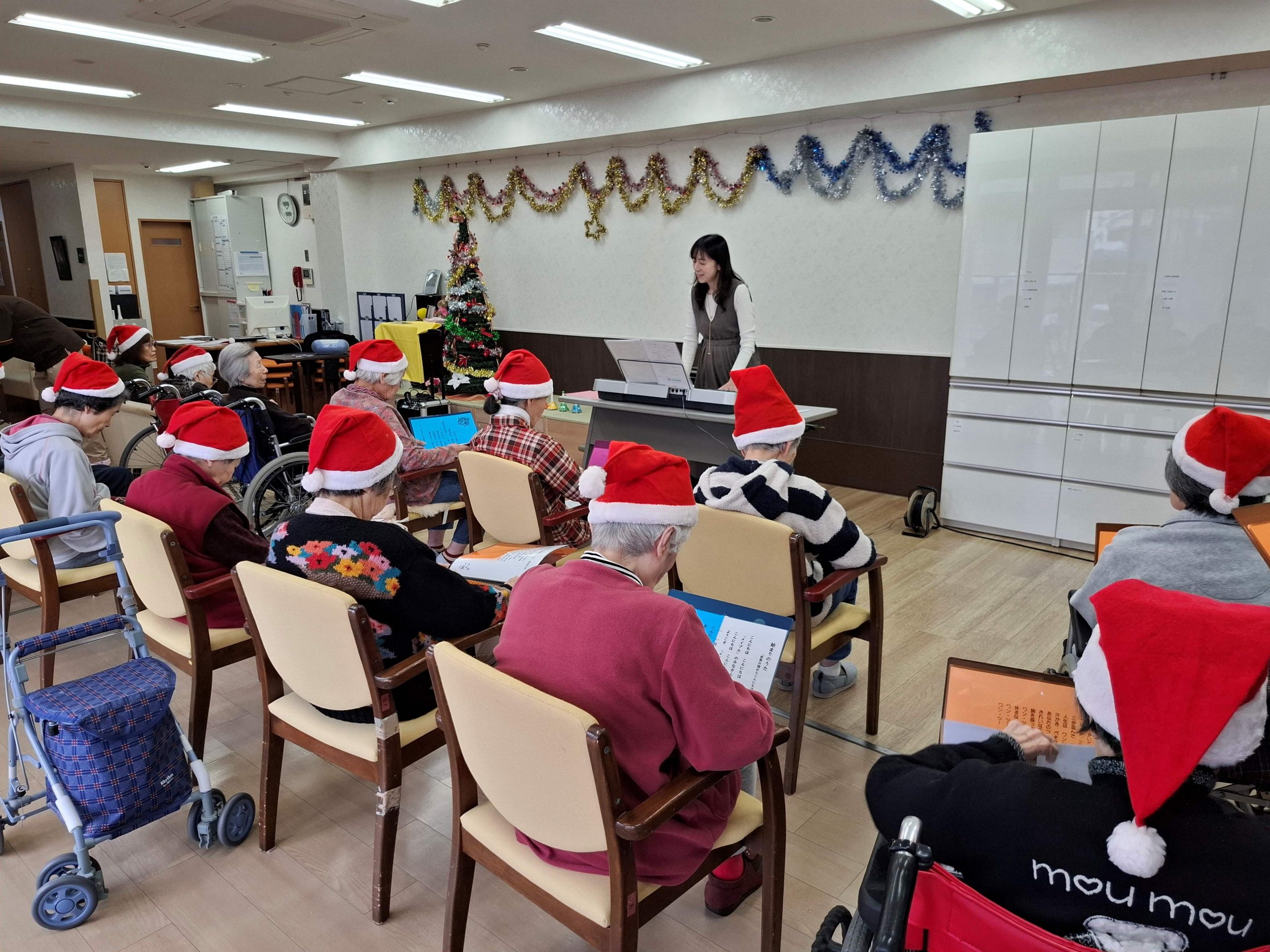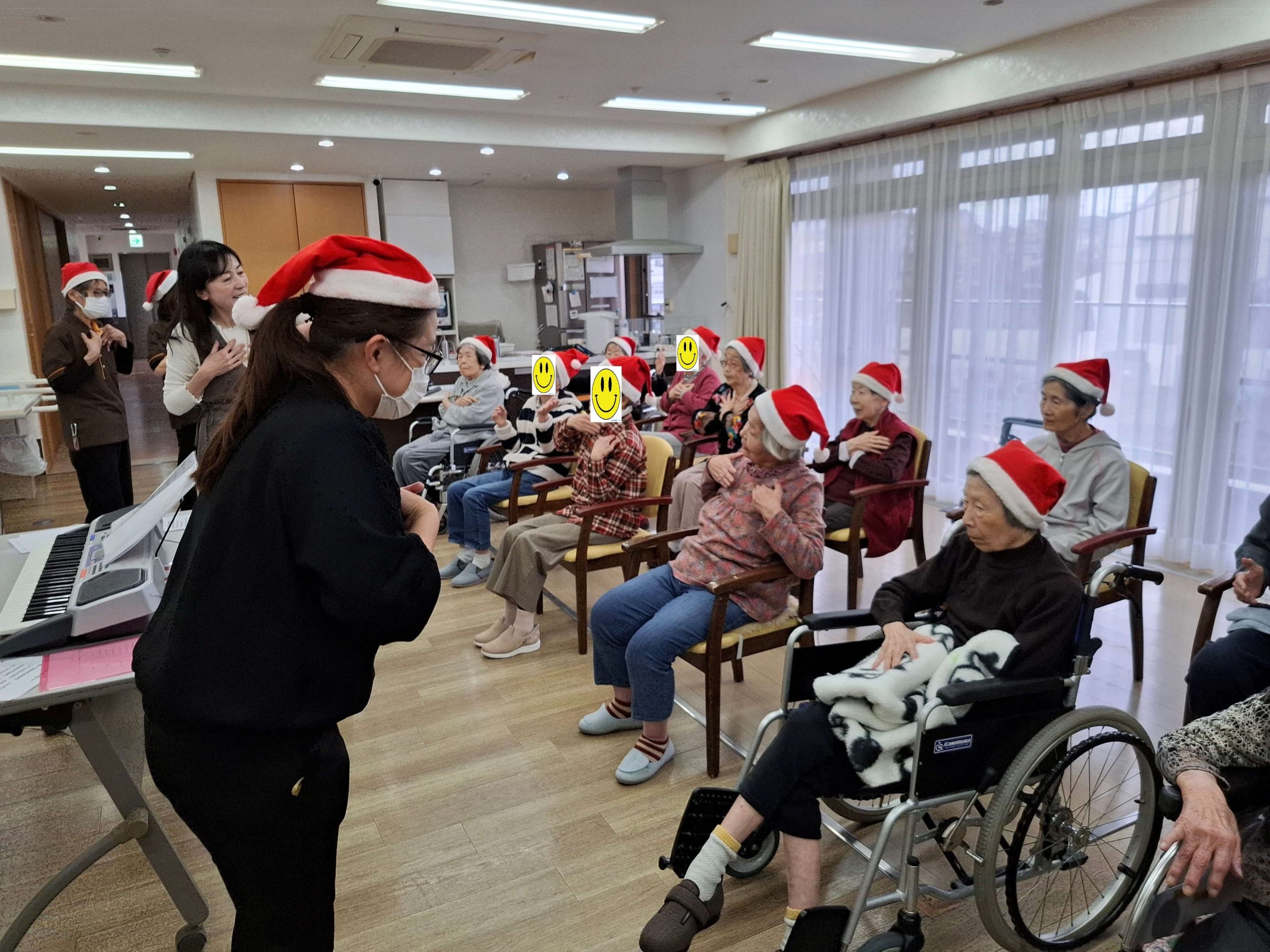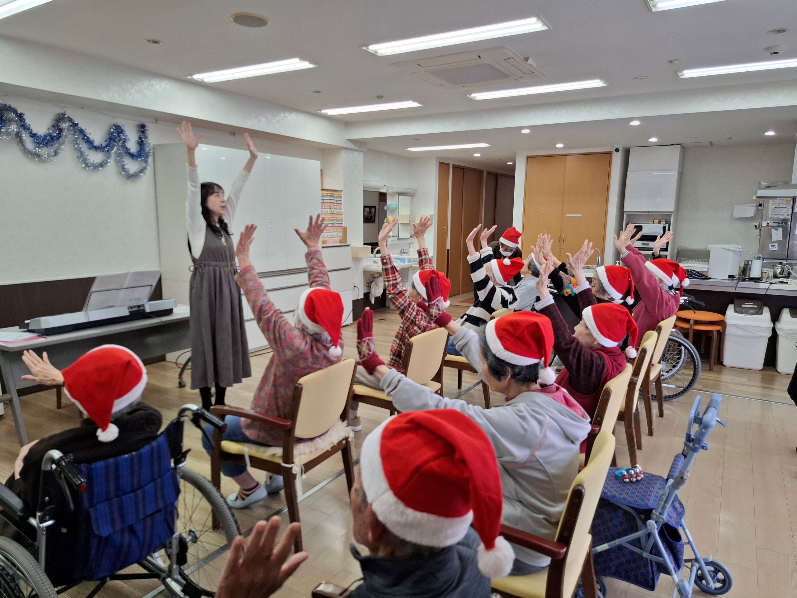 メイプル箕面では恒例のクリスマス会を開催いたしました。今年も音楽療法の谷垣先生をお招きして音楽を通じて楽しいクリスマス会となりました。