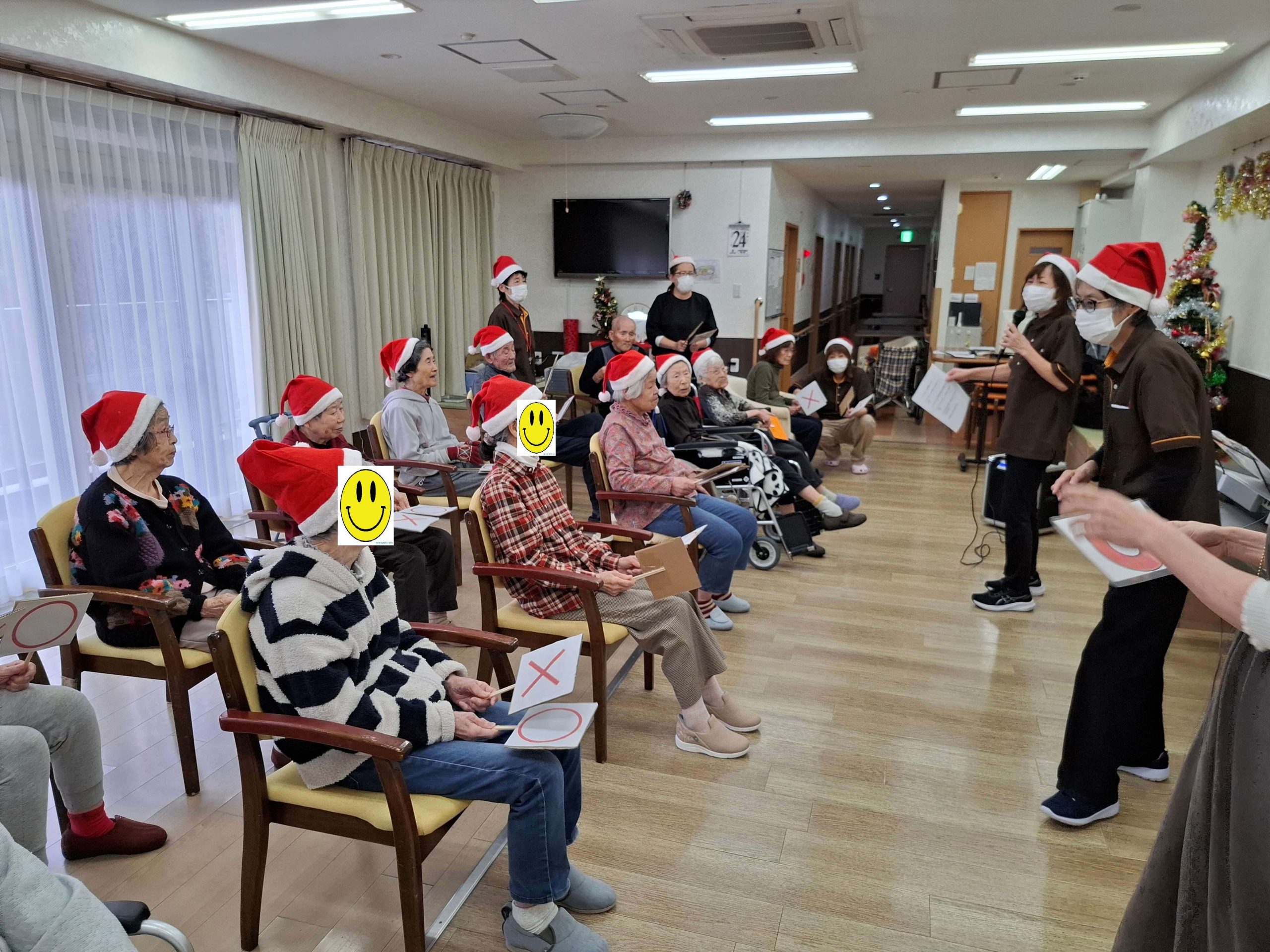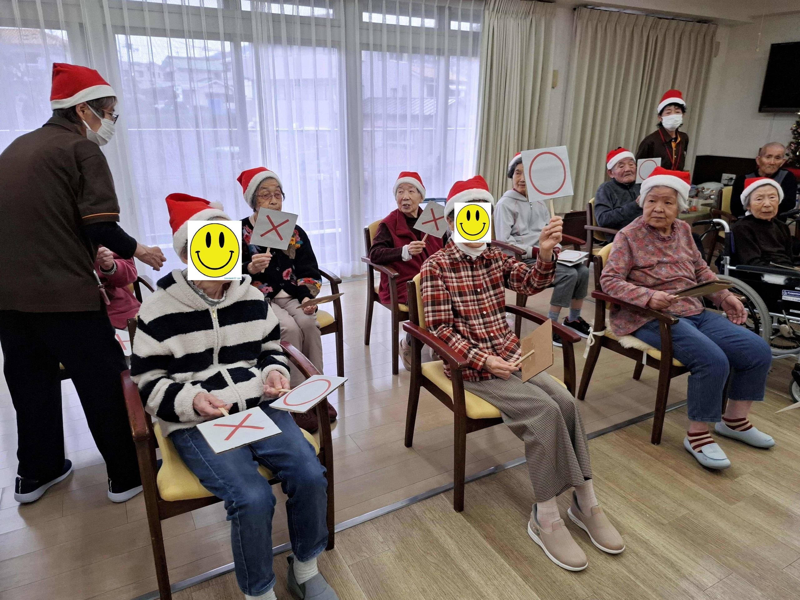 職員がクイズを作成して入居者様は〇と✖の札をあげて答えていただきます。クイズではサンタクロースさんは結婚されているか?というのがあり、実は奥様もいらっしゃるそうです。