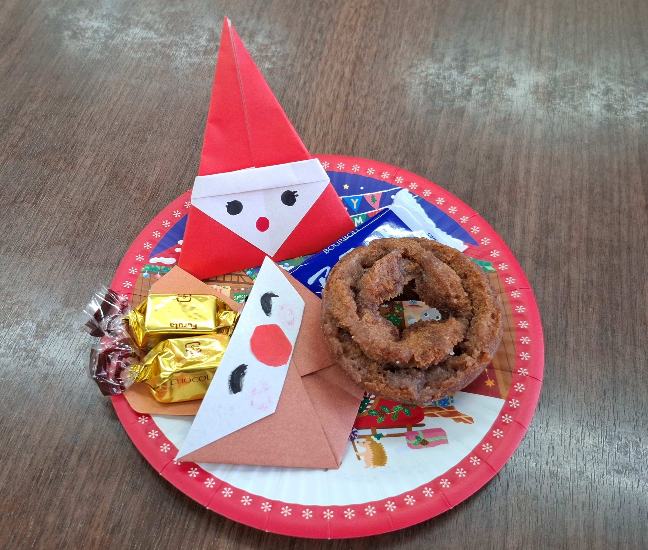2F・3F合同のクリスマス会のあとは、各階に戻っておやつの時間です。クリスマスらしく飾り付けを行いました、
