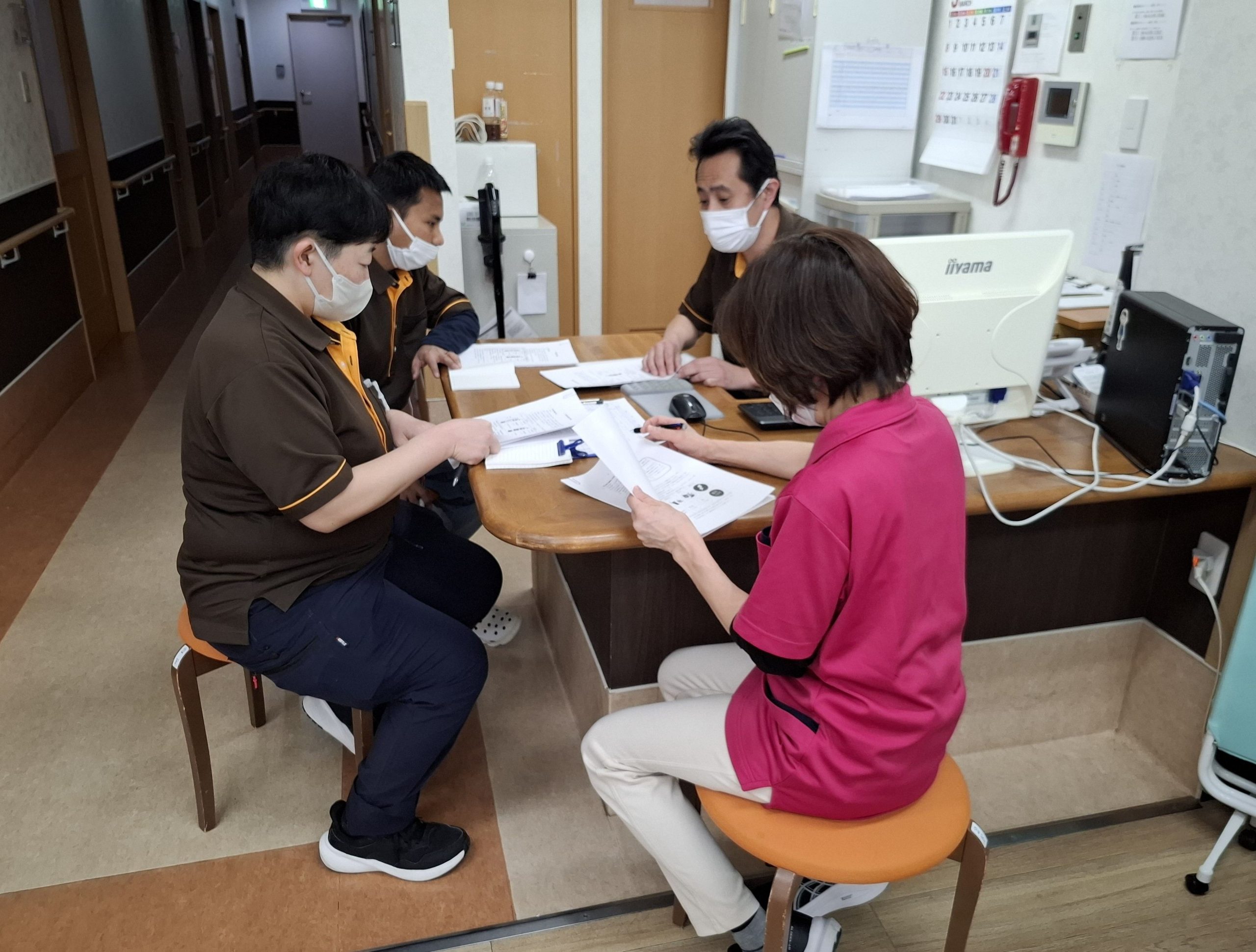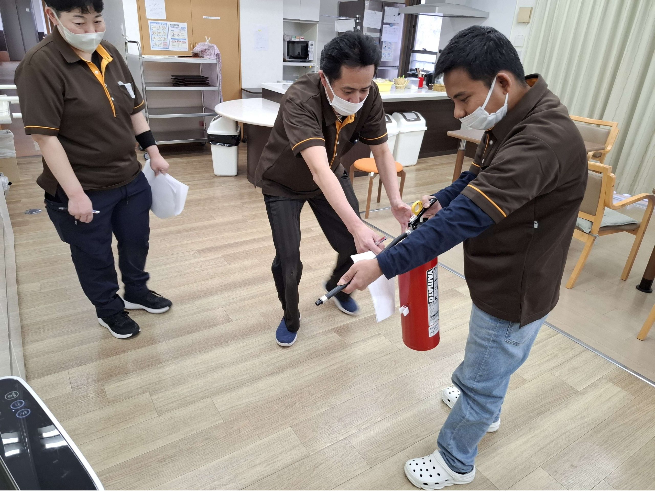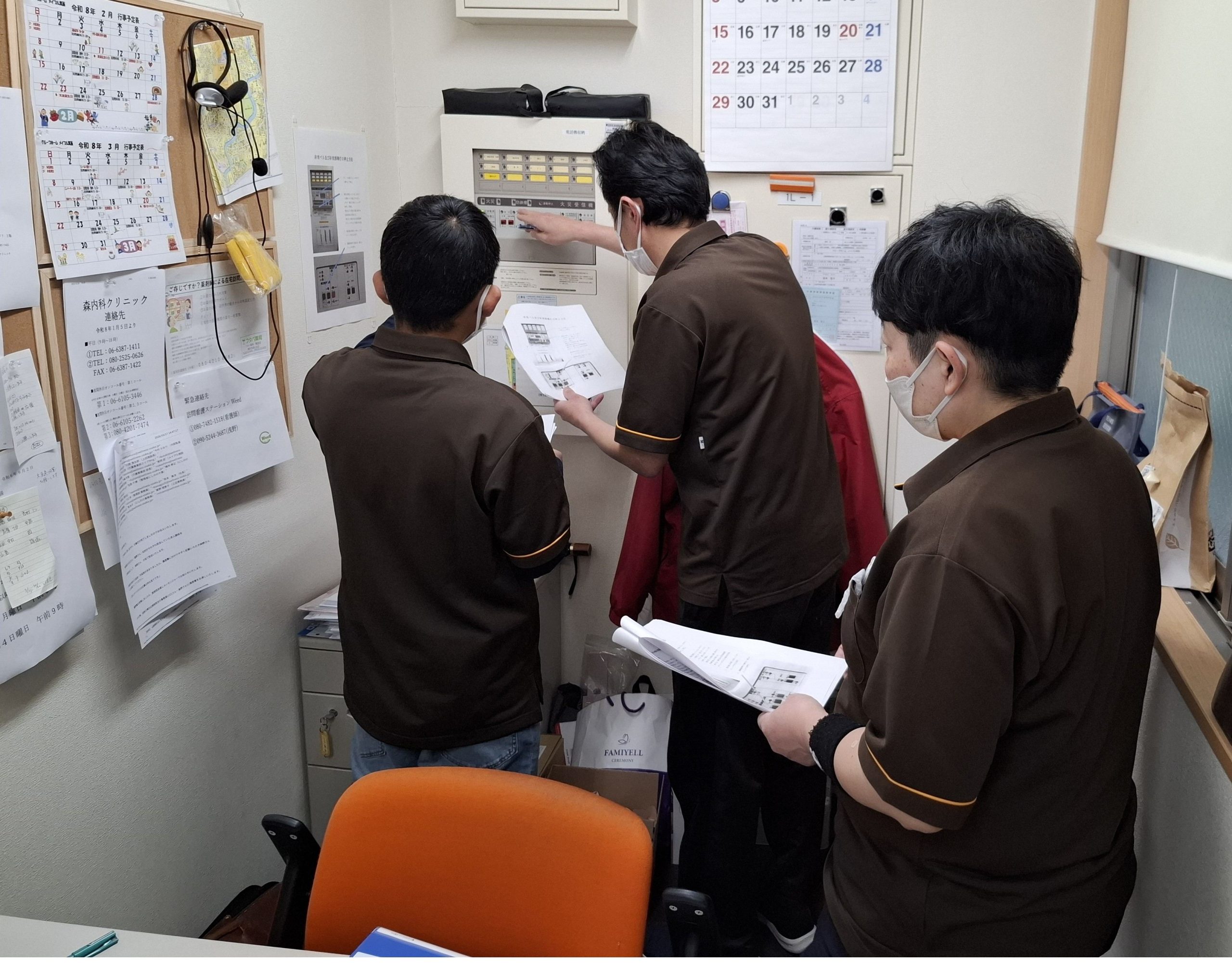 投稿日: 2026年3月22日 投稿者: maple_user ☆ 消防訓練 ☆ 本日、メイプル箕面では消防訓練を行いました。消防訓練は年2回義務付けられたもので、防火管理者によって消火訓練や通報訓練、避難誘導訓練などを行います。 最初に防火管理者より消火器の設置場所や煙探知機、スプリンクラーの設置個所の説明などを行います。 その後、実際に消火器を手にもって使用訓練です。 最後に事務所内の火災受信機の説明を行い、非常ベルや避難誘導灯の停止方法などを学びました。