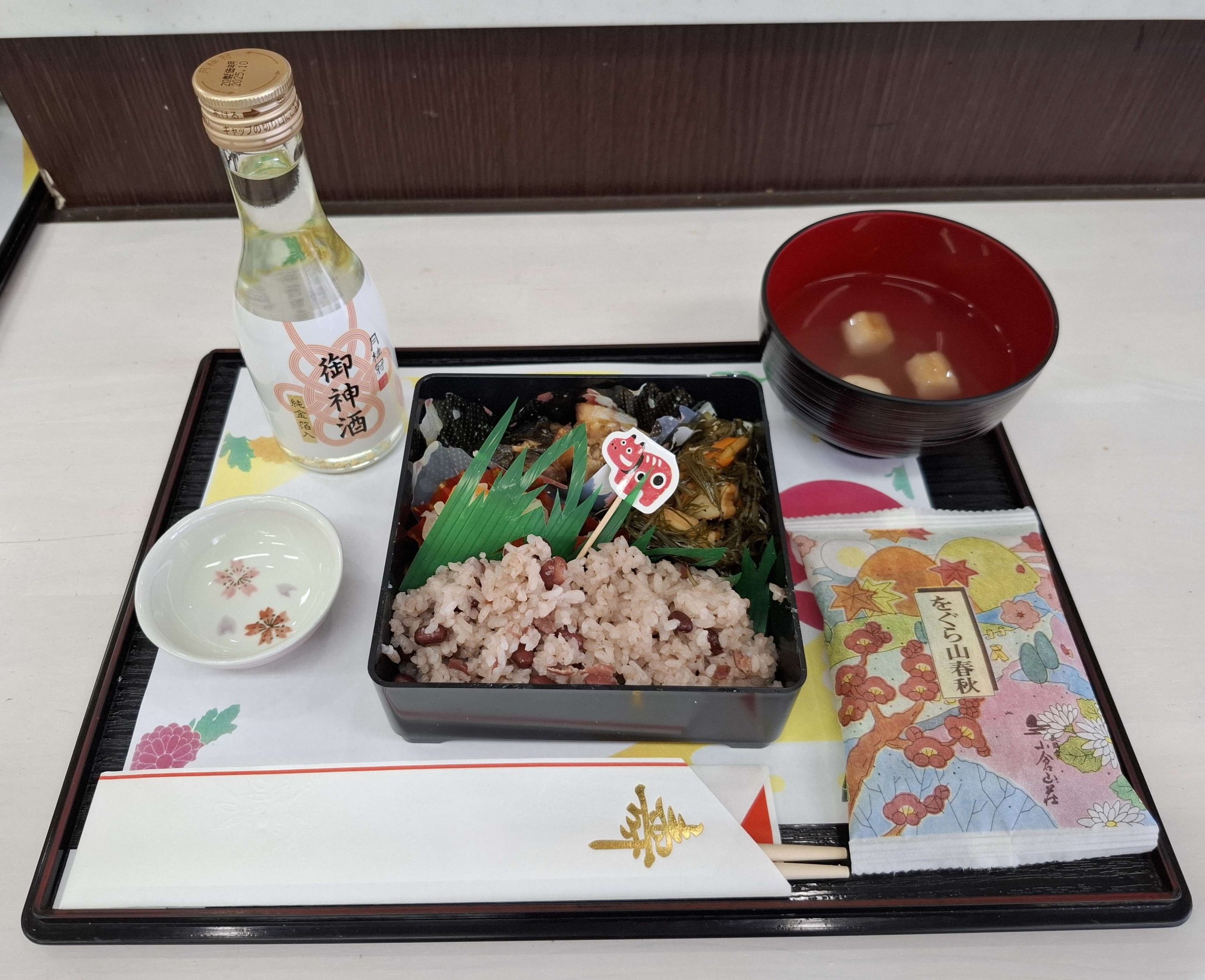 美味しそうなおせち料理の完成です。お神酒とお菓子も付いています。 祝箸には箸袋にお名前も各自でお書きいただきましたが、AIの技術で消させていただいています。
